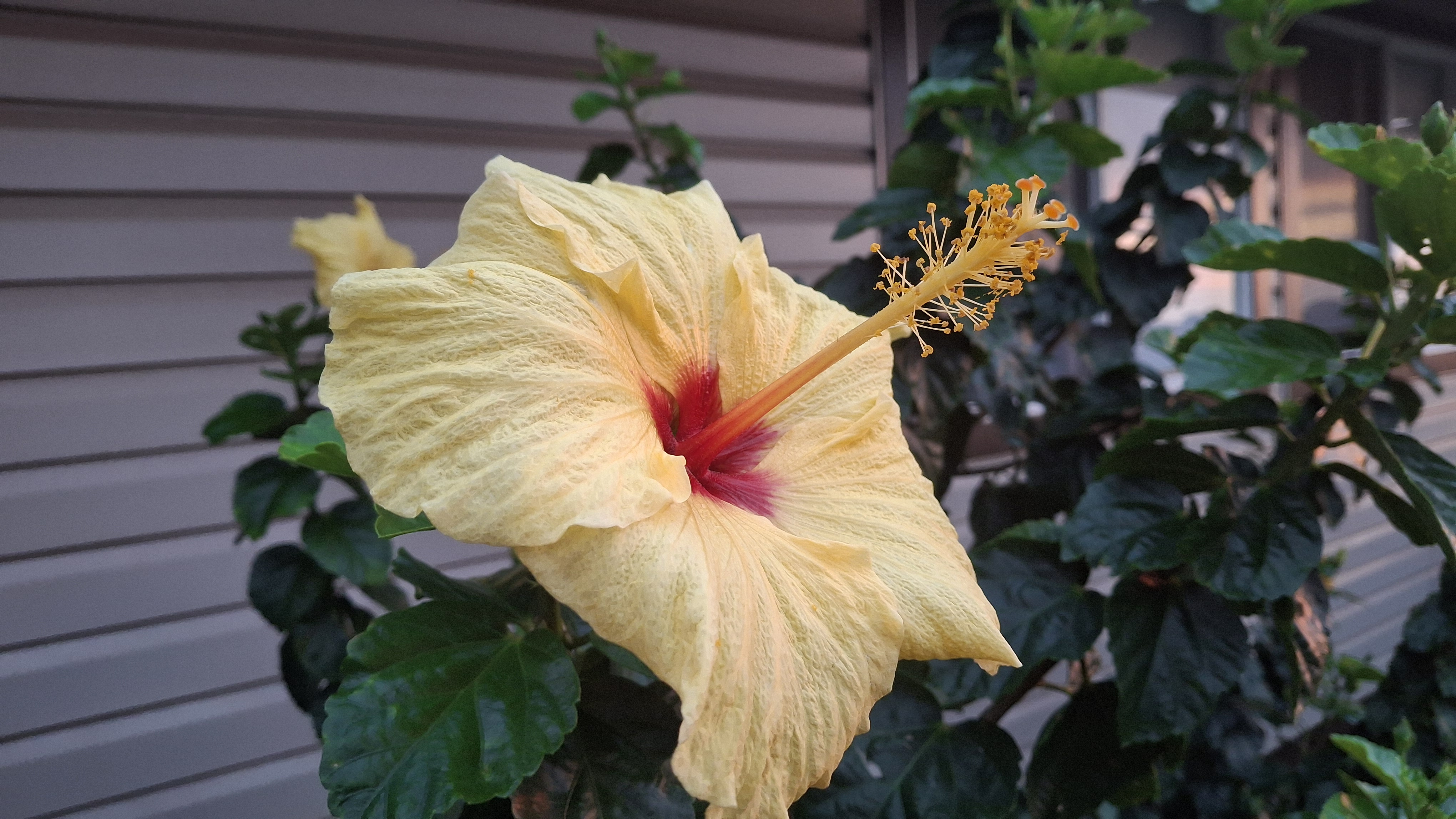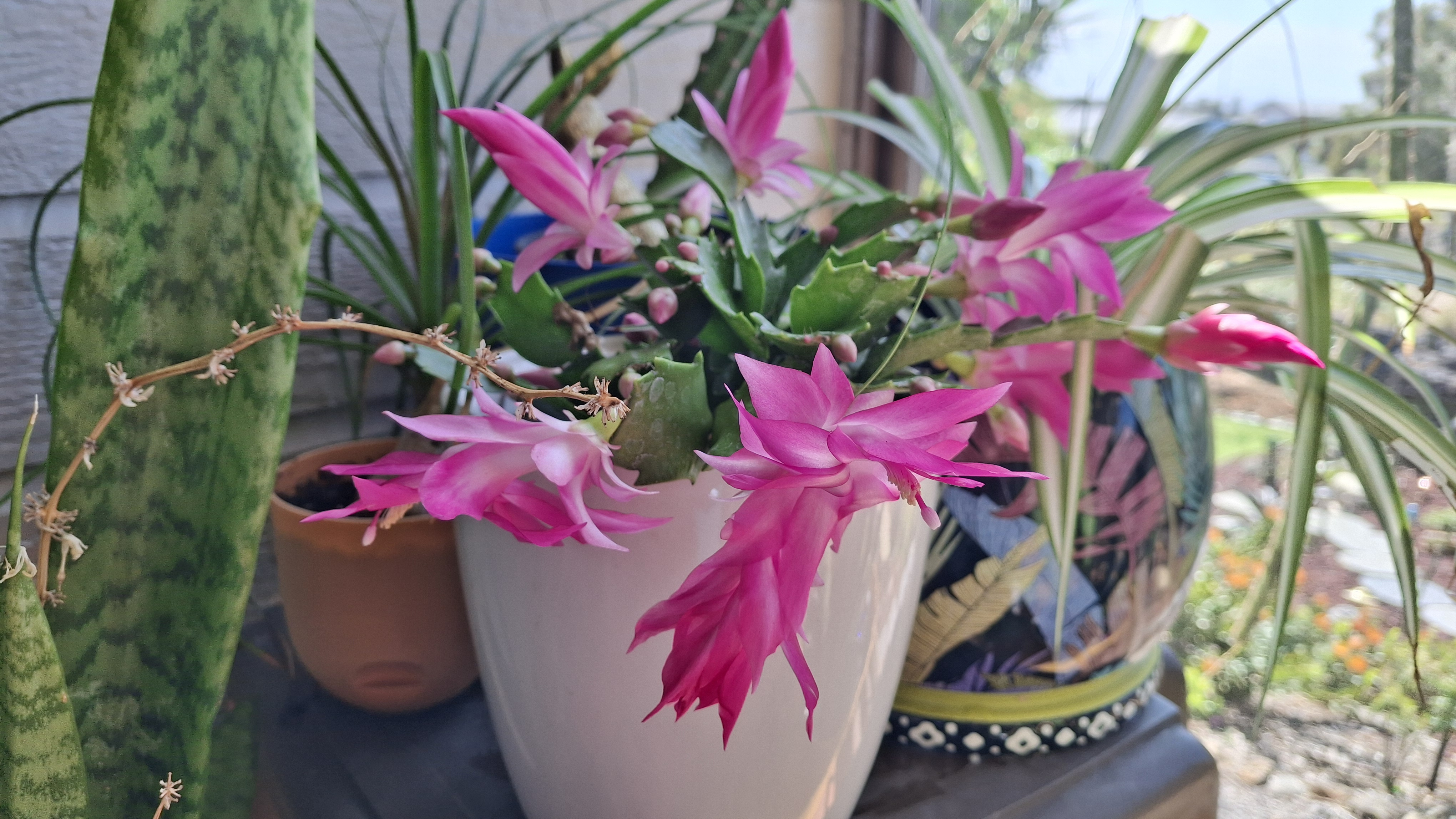 They have an avocado tree (no fruit yet), a mango tree (second set of fruit looking good but not ripe until later), and several banana plants (lots of little green bananas, and some yellow ones on the neighbour’s tree which hangs over the fence line… does that make them fair game??? PS YES THEY WERE FAIR GAME – AND DELICIOUS!!!), plus lots of herbs and a small raised bed with vegetables which are already growing like crazy even though they were just put in a week ago (some of the string beans look almost ready to eat!). Most of the potted plants are succulents, which are easy to care for. However, mixed in are ferns, peace lilies, poinsettias, a lovely orchid, a bunch of stuff that I know we have at home as houseplants, some variety of milkweed with only 2 leaves left on it which already has a Monarch chrysalis attached to the side of the pot, something that looks like polka dotted begonias on steroids, and countless things I can’t even name! As well there are flowers planted right in the ground, like the towering hibiscus plants in a variety of colours, and an amazing coral flower called a Crown of Thorns, which has the most wicked looking stems I have ever seen.