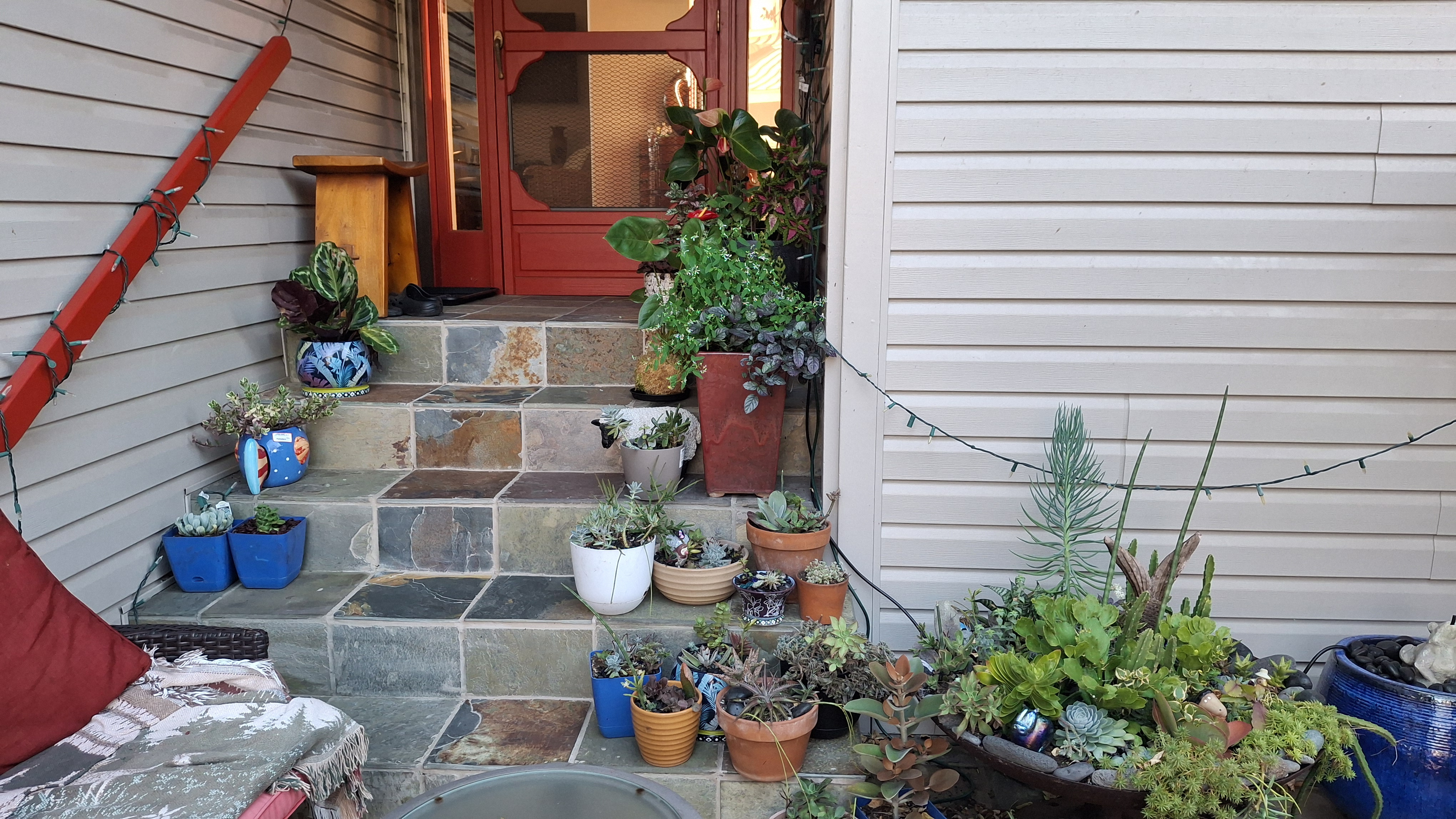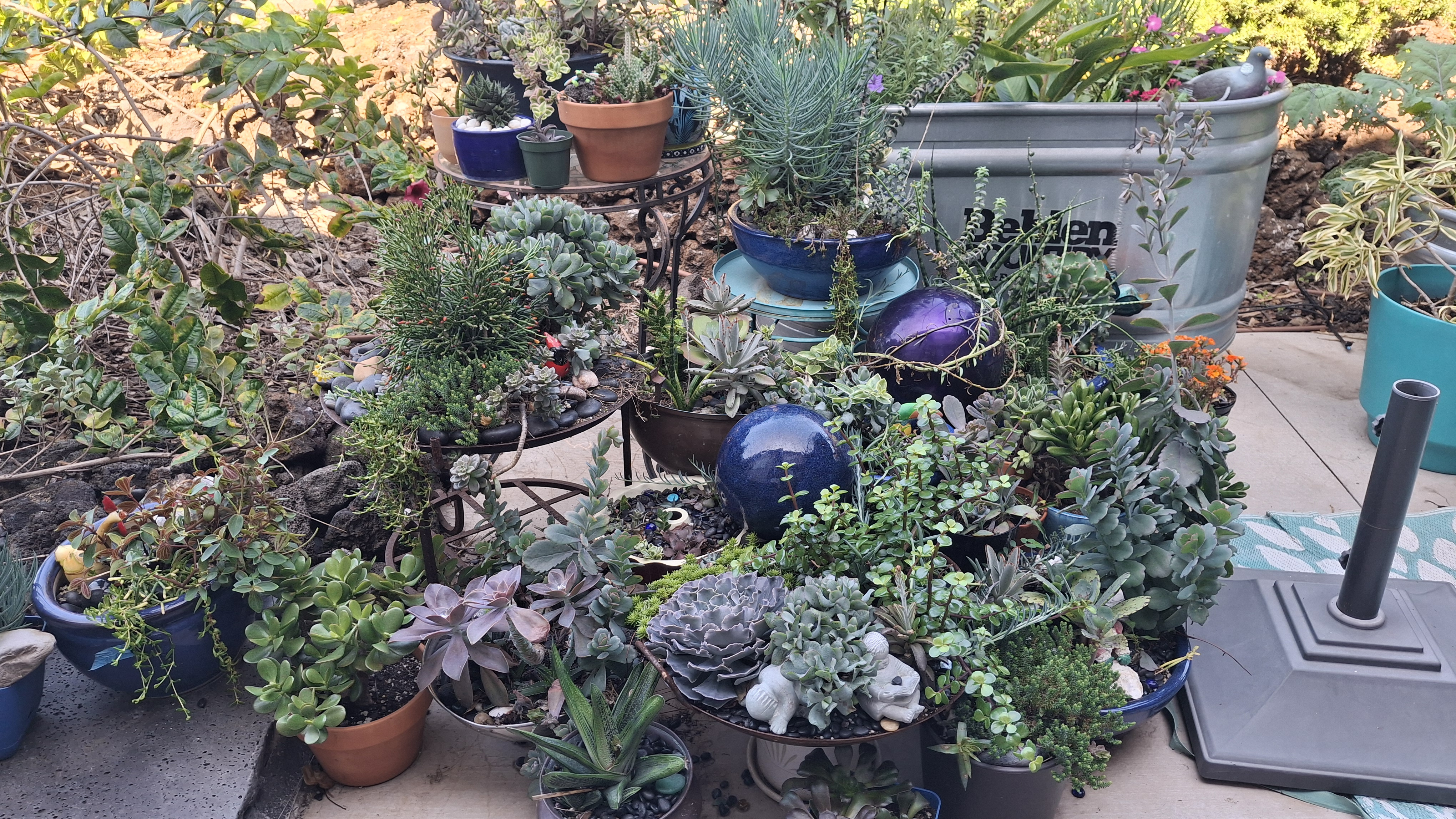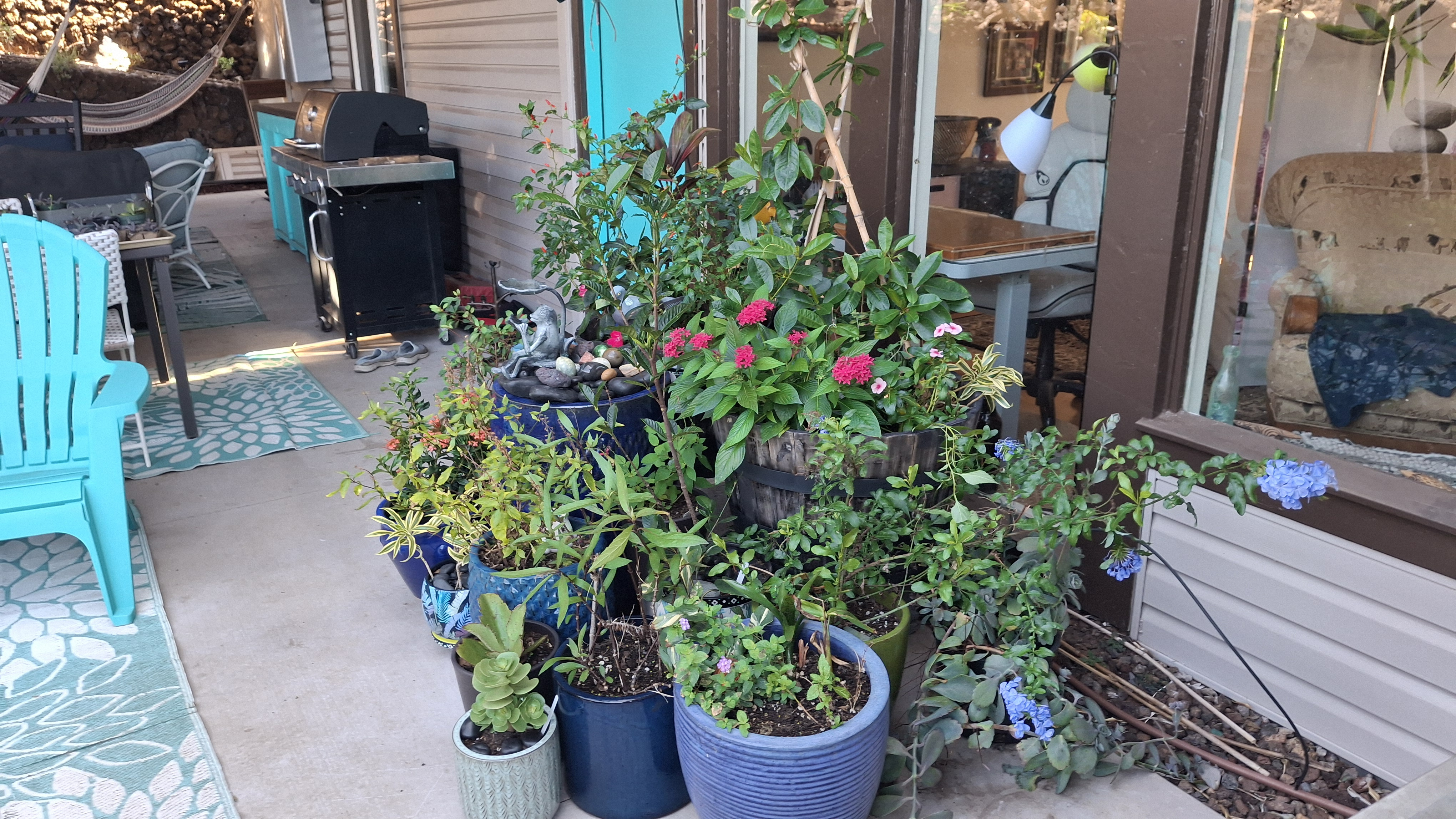 When we applied for this sit, they were much more concerned with the garden than they were with the pets! And now I know why! I have never seen so many potted plants outside of a garden centre. They are all the way around the outside of the house. From my current seat on the Lanaii, there are 42. Then they line both sides of the stairs going to the front yard (about a dozen more), in front of the garage, under the banana trees by the side yard, under the back deck (another 143, and along the lava rock wall and walkway going across the back yard. Plus a half dozen gigantic pots on the top deck. At least there aren’t any inside!