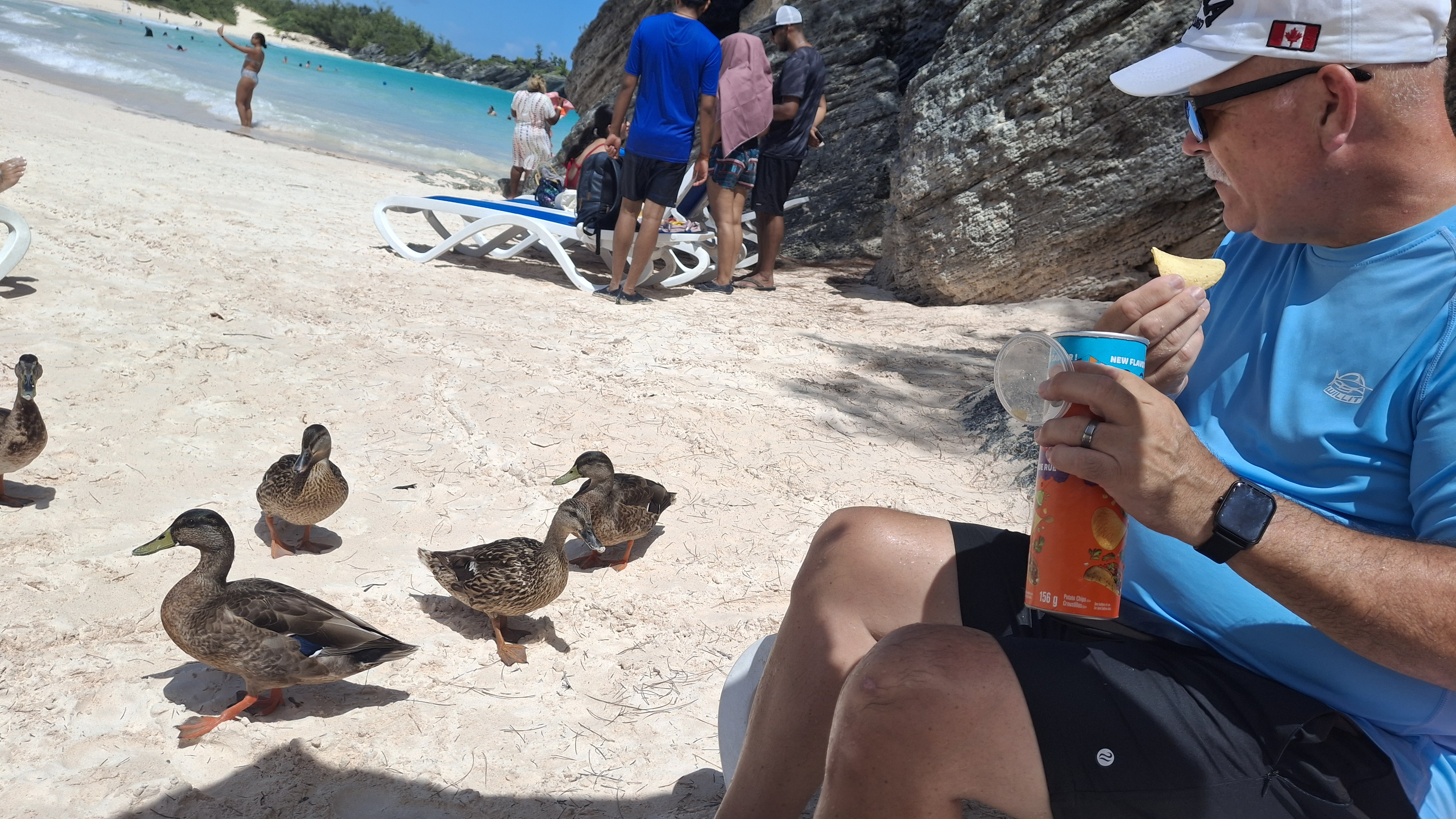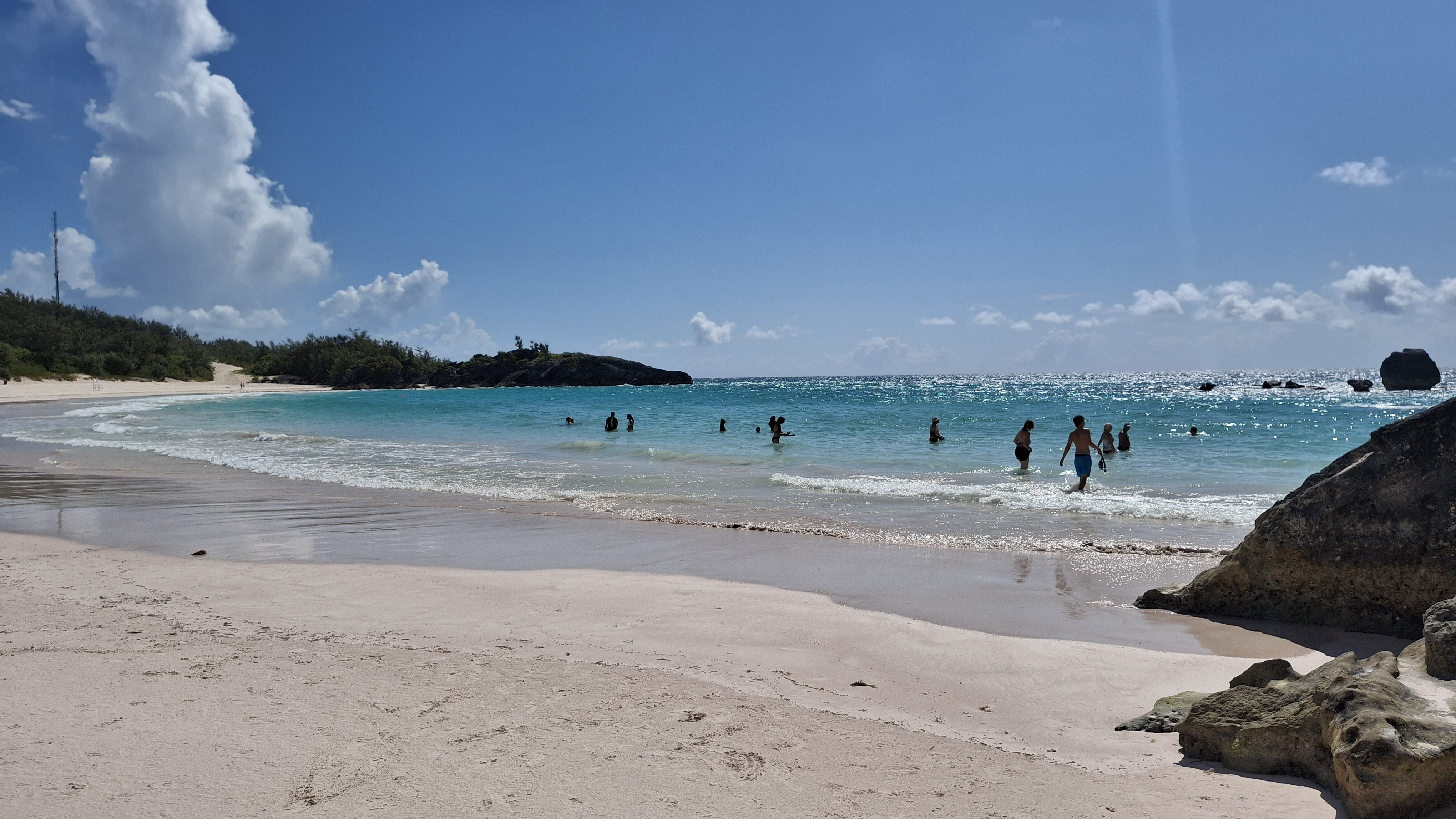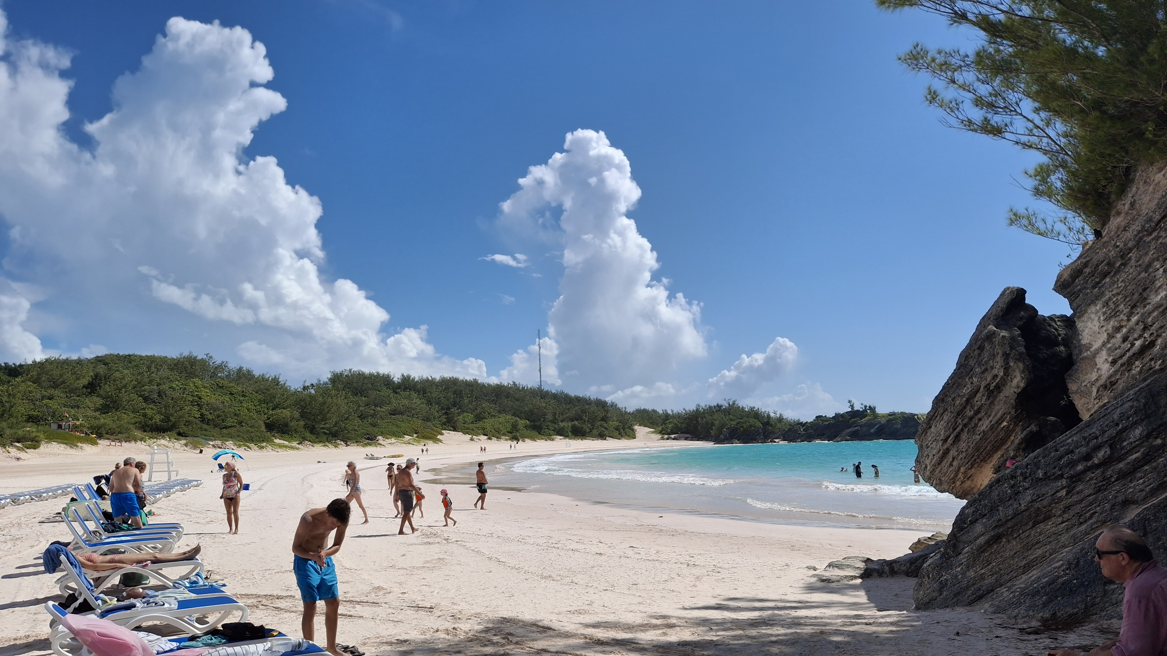 Everyone local told us to get to the beach early if we wanted to rent chairs, as it tends to get really crowded later on, and there was supposed to be 2 cruise ships in port at the Dockyards, one with 5000 passengers. I was feeling a bit guilty for lollygagging (we like to enjoy breakfast outside on the front porch, then get dressed later) as we didn’t make it to the bus stop until around 9:30. But the other lady at the bus stop told us we were doing great and would be there early. And we were! There was likely only 20 or 30 people there, and it is a very big beach. The water of course was a beautiful turquoise, and the sand was a fine pinkish beige white. The water temperature was fabulous! very likely 90 degrees or more (for anyone who still thinks in farenheit), so maybe around 28 degrees Celcius, ish.