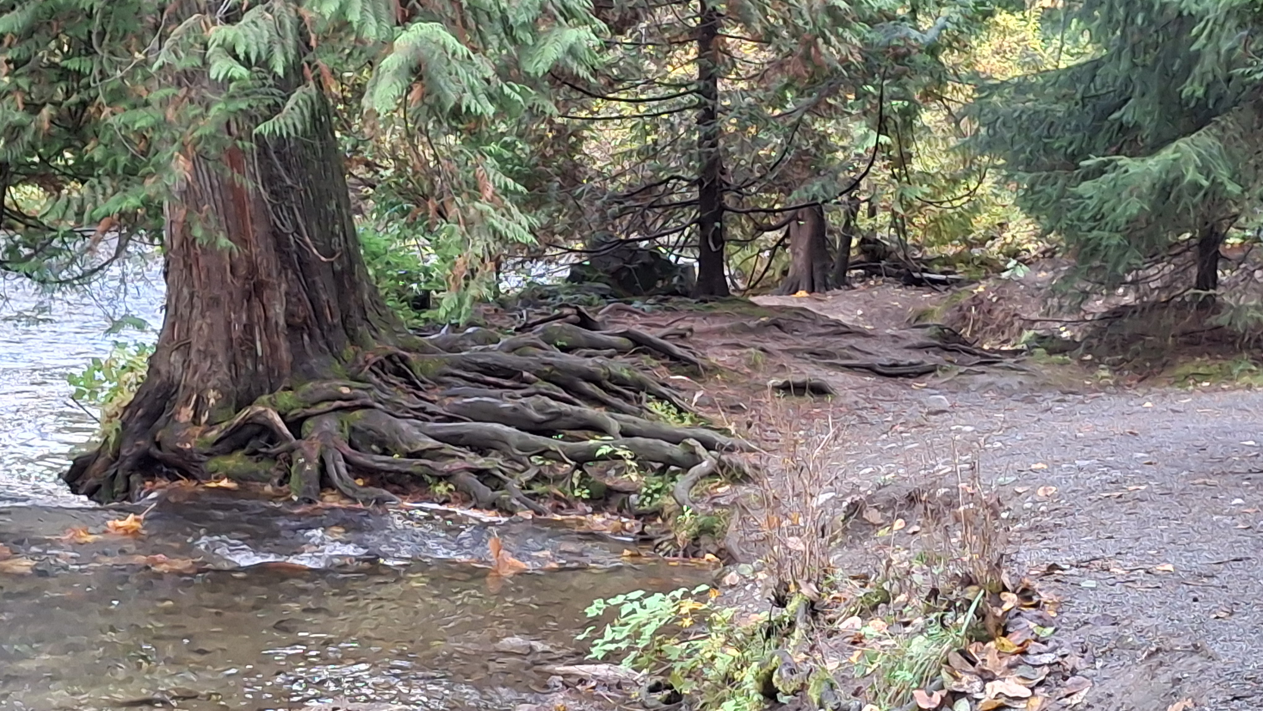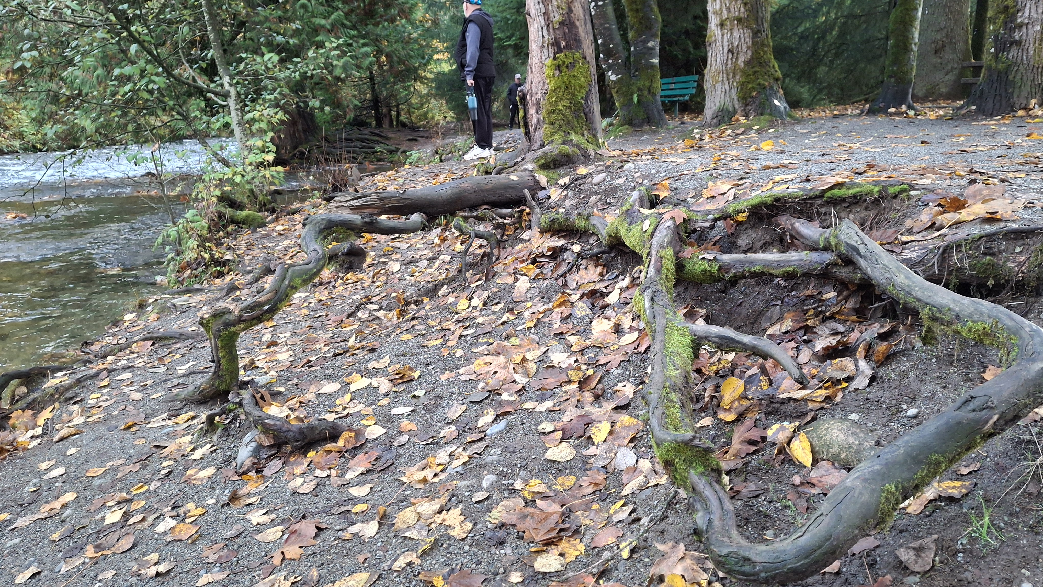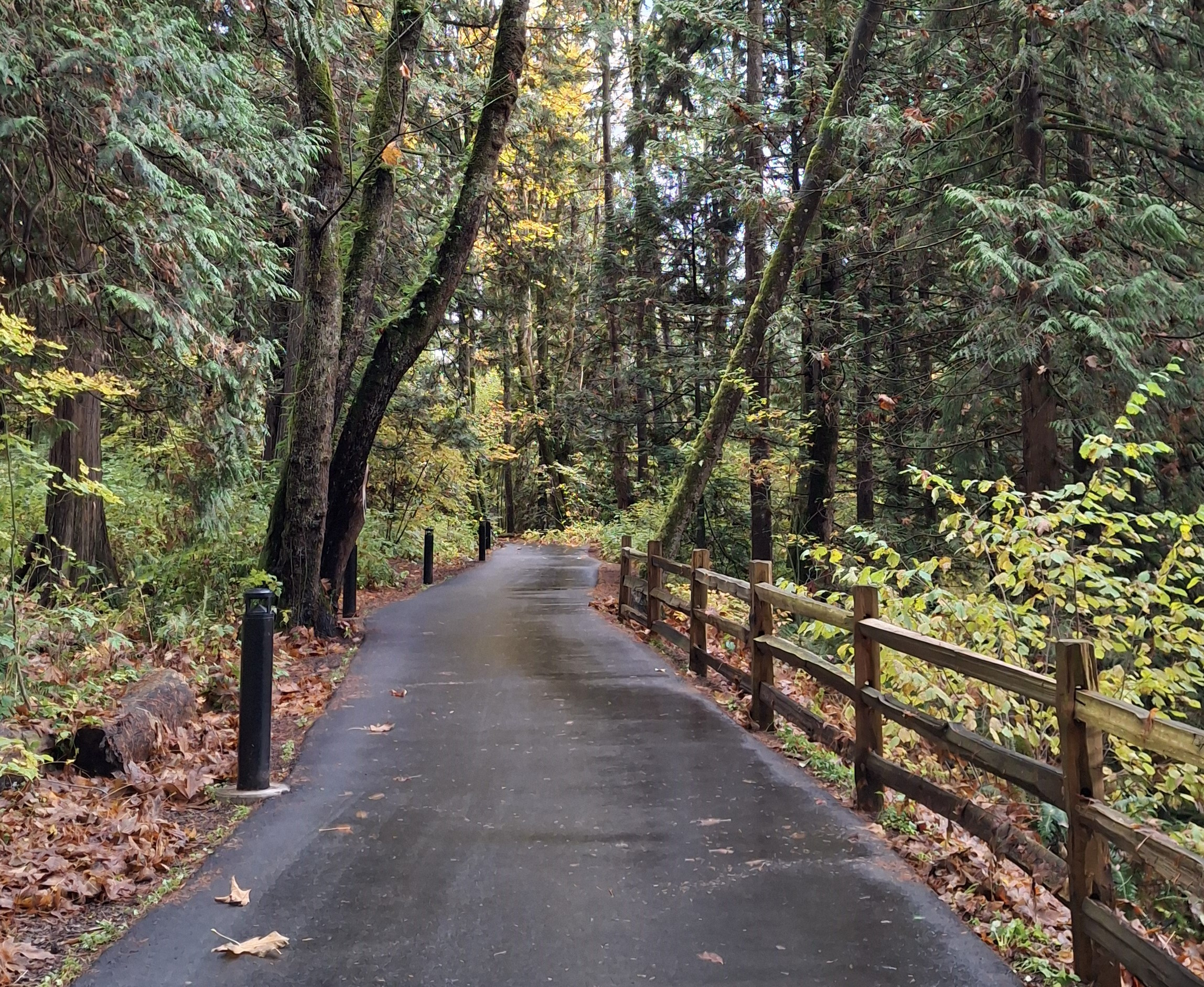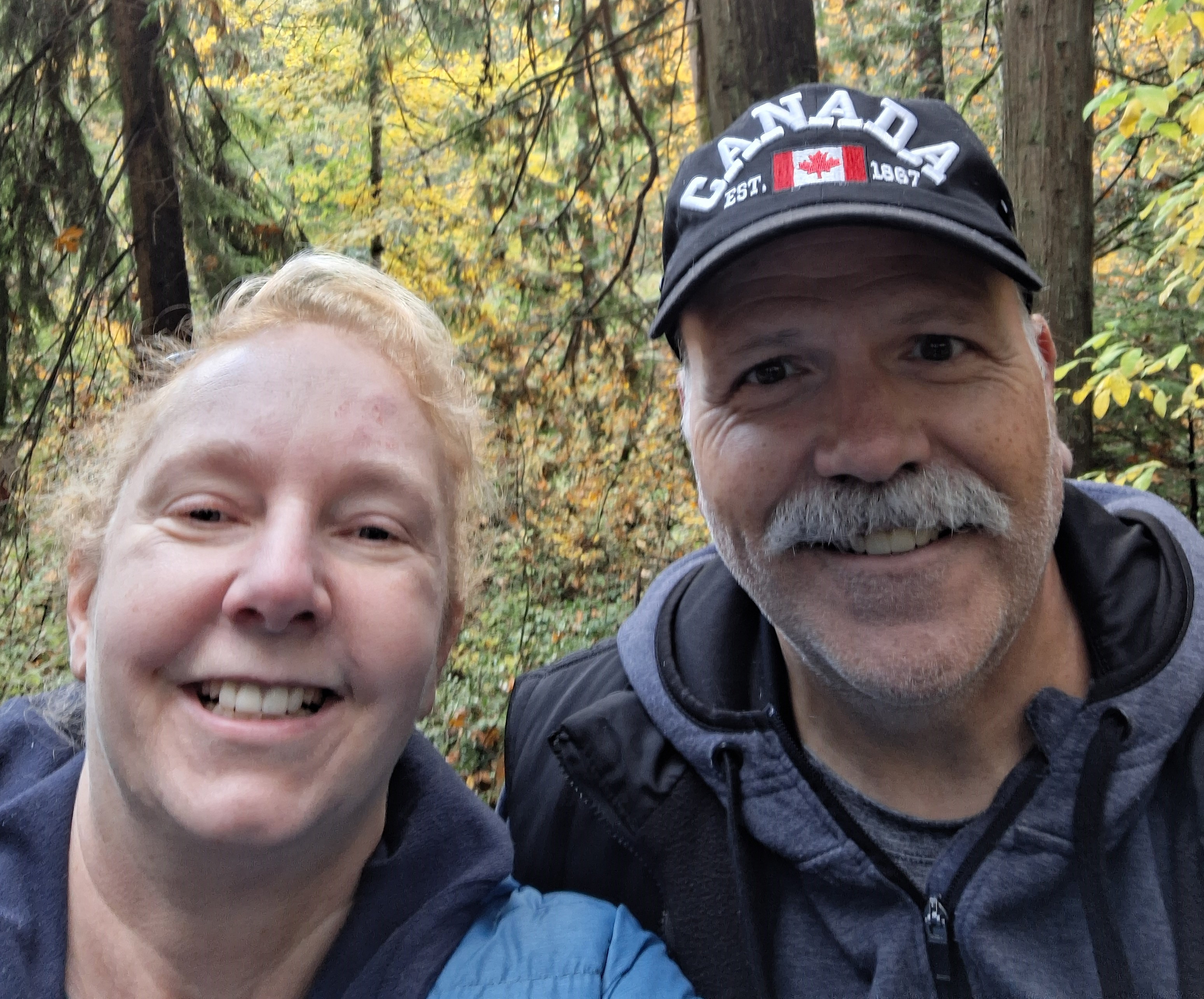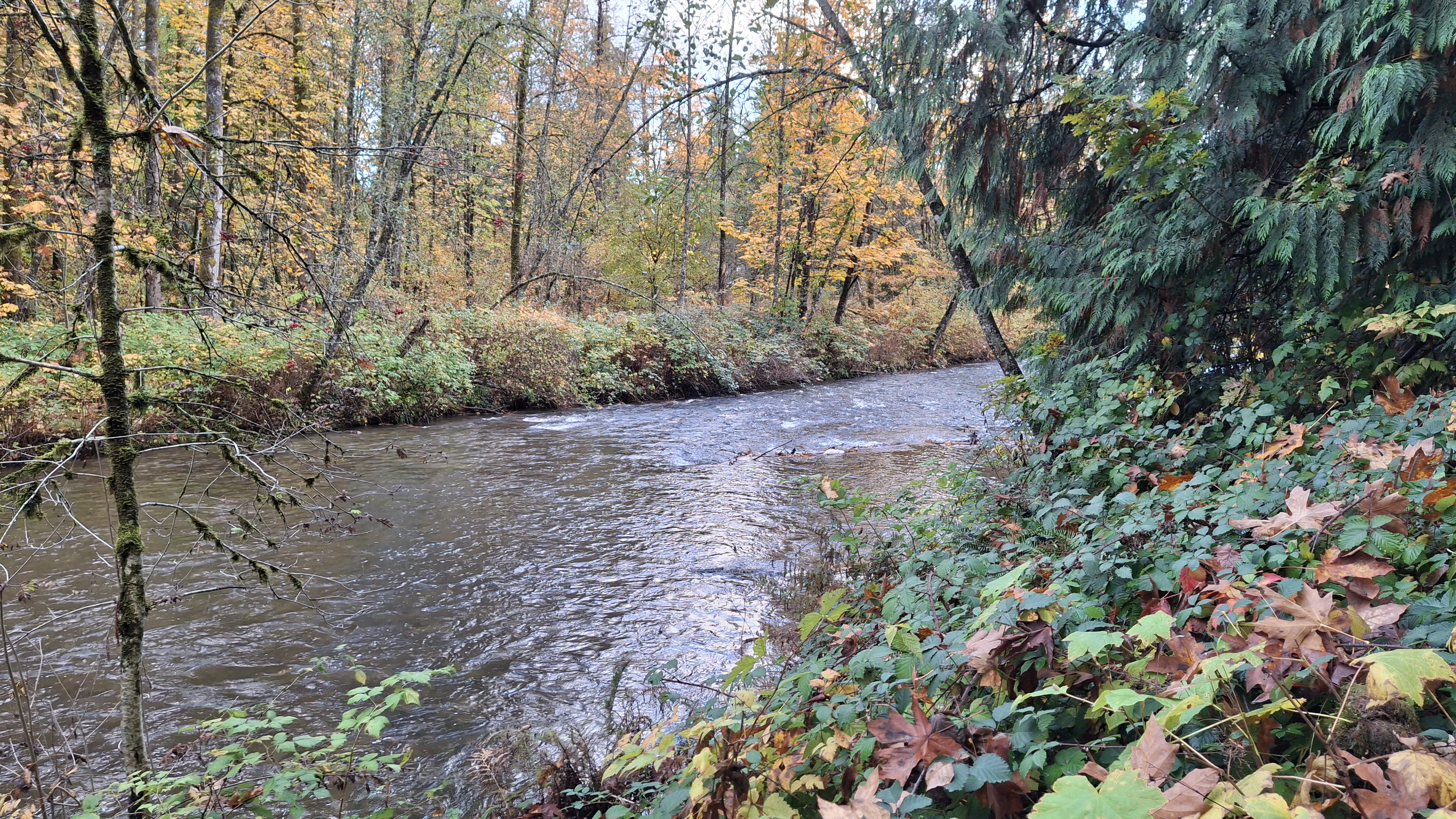 On the 6th day of rain, the sun came out at 3pm! It was such a joyous moment that we had to go outside and go for a walk someplace that the trails hadn’t completely washed away. We headed over to Maple Ridge Park for a little stroll. It has fairly level trails, a lot paved, and many spots to stop and watch the fish run. All in all we were out for a whole hour without getting rained on – whooohoooo! And yes, we did see the fish going upstream. A local fellow let us know that yes, the water level is still quite low (even with the last 6 days of rain). Late October is spawning season for Coho, Chinook, Chum, and Pink Salmon. What we saw were fish maybe 18 to 24 inches long, and no, I couldn’t identify any of them (unless labelled for me in a grocery store!)