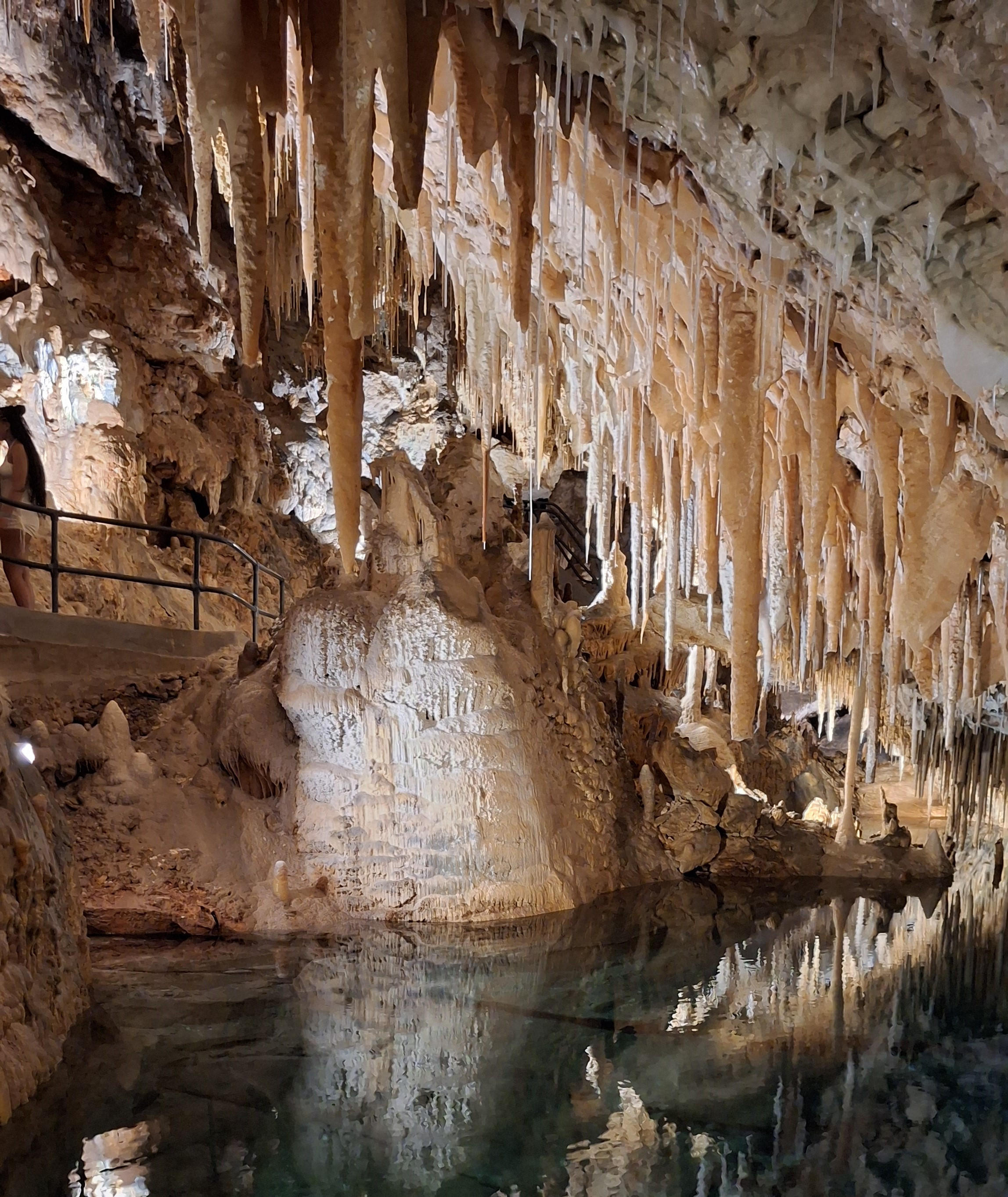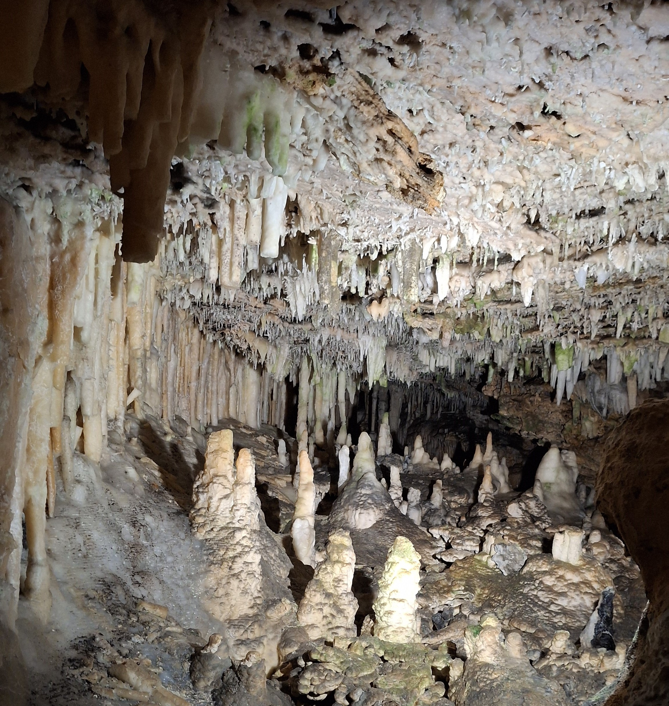 The caves were discovered in 1907 by a couple of young boys who were playing cricket in the area, and their ball rolled into a hole in the ground. They ran home and got some rope and a kerosene lantern, and went down the hole after it. They ended up falling into a pool – and there went their lantern! So they are now in the water in a cave without a light. They decided it would be a good idea to swim around and explore it for the next few hours, even if it is dark as pitch down there. Eventually they made their way out – and the family who owned the property explored the caves and opened it for tours. Originally there would have been some rappelling down, and you would take a row boat across the water. Back then people were allowed to cut off a piece of the stalactites (which really do look like icicles or hanging tallow candles) as a souvenir. Now, they have a strict “do NOT touch anything here!” policy, as the oils on your hands will cause the minerals to break down. The stalagmites and stalactites are still growing, averaging about an inch every hundred years, as the rain water leeches through the limestone and brings calcium carbonate with it.