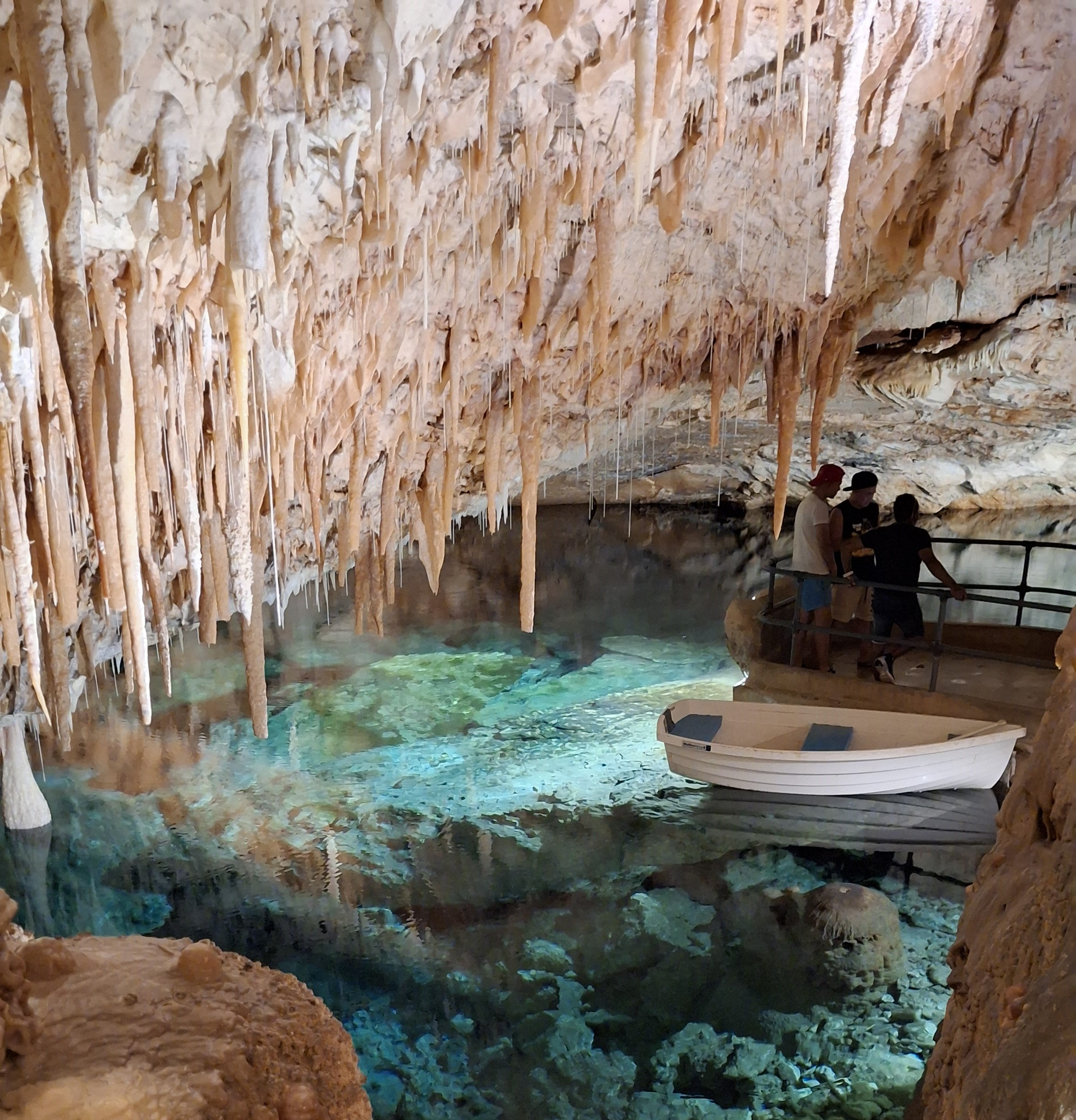 The first caves we went into were the crystal caves. The entry way was pretty wide, so about 3 people could walk side by side, and the first section was a ramp. Then there was 88 steps down the staircase, which is broken up with some landings. The water in the cavern at the bottom is about 15 feet deep by the bridge, and about 85 feet deep over by the outside wall. The water goes underground for another mile after the main cavern ends. The bridge is like a large floating dock system, which rises and falls with the tides. Since we arrived around noon, the tide was out and we were able to walk upright everywhere, but apparently you have to duck a lot at high tide!