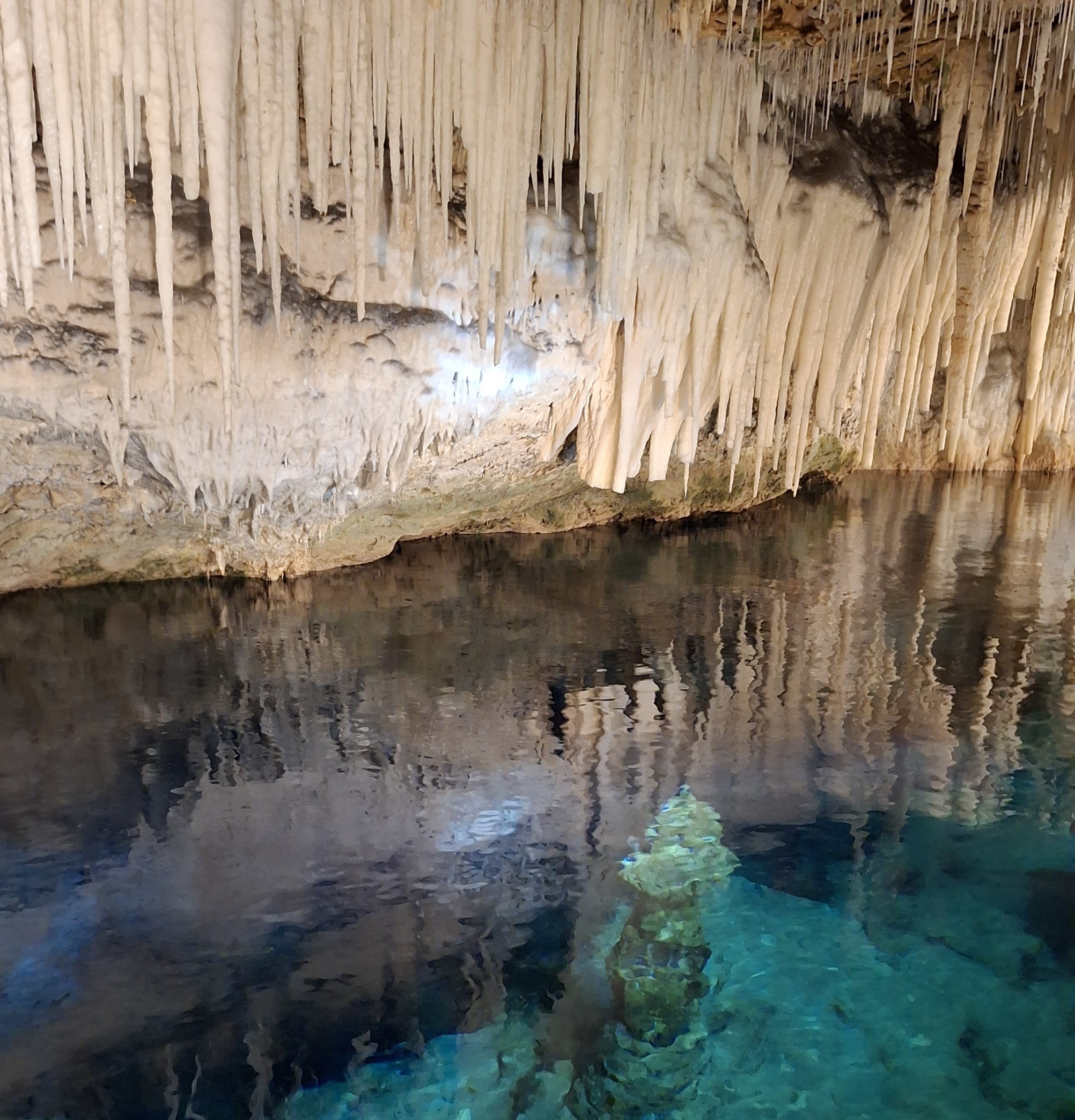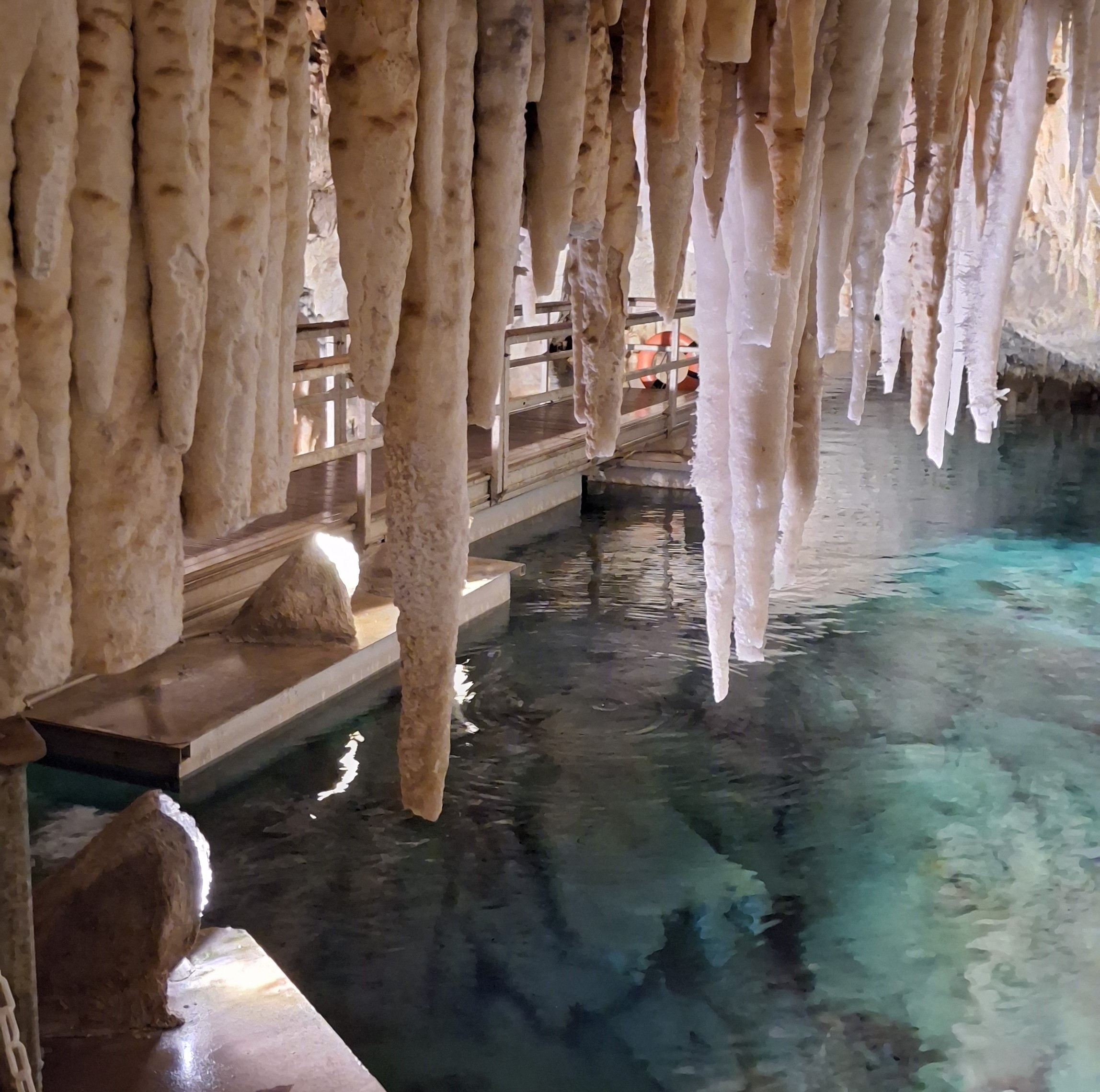 The second cave system we went in had concrete walkways, but they were very narrow, and the staircases were steep! 83 steps. The water in this cavern was even more clear and bright than the first one. It looks shallow, but it is very deep (and apparently cold.) Although everyone is warned to not drop anything, the guide pointed out the area at the end where there were several pairs of sunglasses, about 6 cell phones, and a passport – all dropped in the last month! They will send in a diver for the passport, as the poor man does need to depart next week. Otherwise, they send in a diver over the winter to pull everything out, so they can start the next season fresh. Our tour guide says that is how he gets all his new sunglasses, lol!