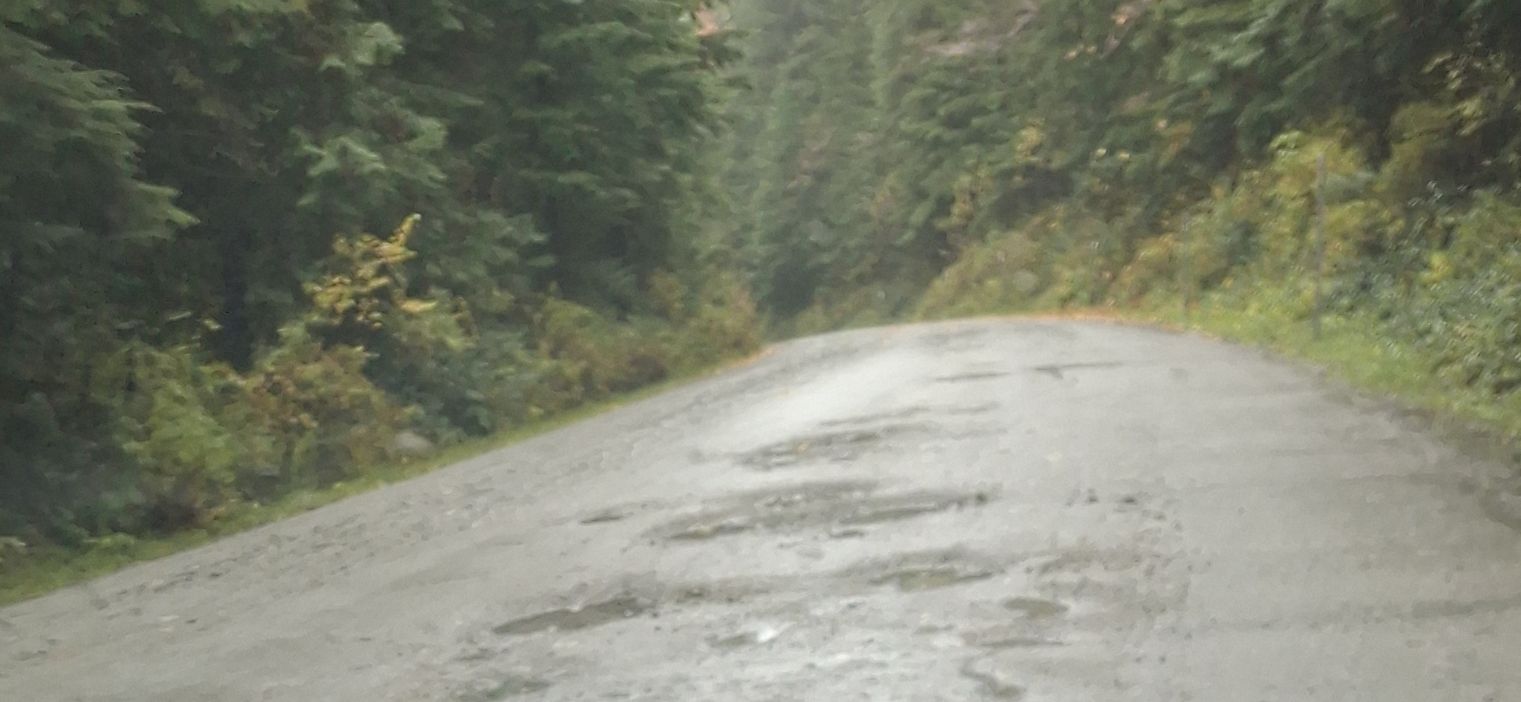 It was a very long drive to get that far into the park to pick up that trail. Unfortunately we could see a lot of cloud cover… and then it started to spit. The last 180 metres of the road was unpaved, and after many days of rain it was more big potholes than road! OMG, it felt like we were in Cuba! So we had to drive accordingly! The regular road had a 60km/hr speed limit, but this section dropped it to 30, which was still WAY TOO FAST! We were going 10! And at several places, we had to cross over to drive on the opposite side of the road on the shoulder!