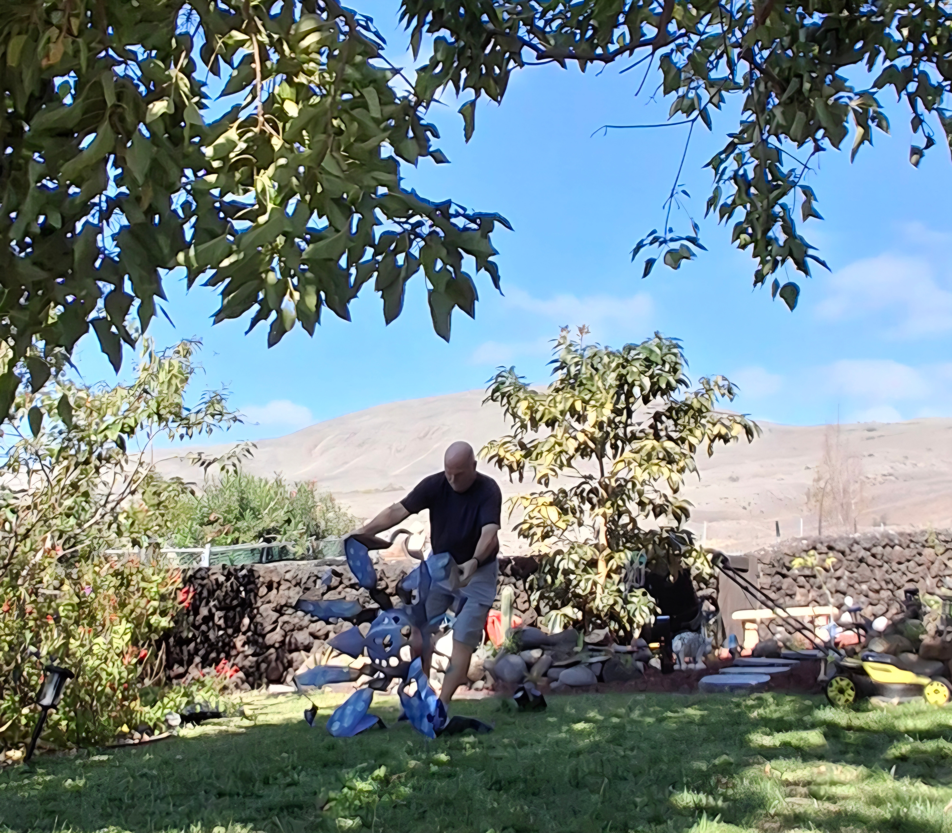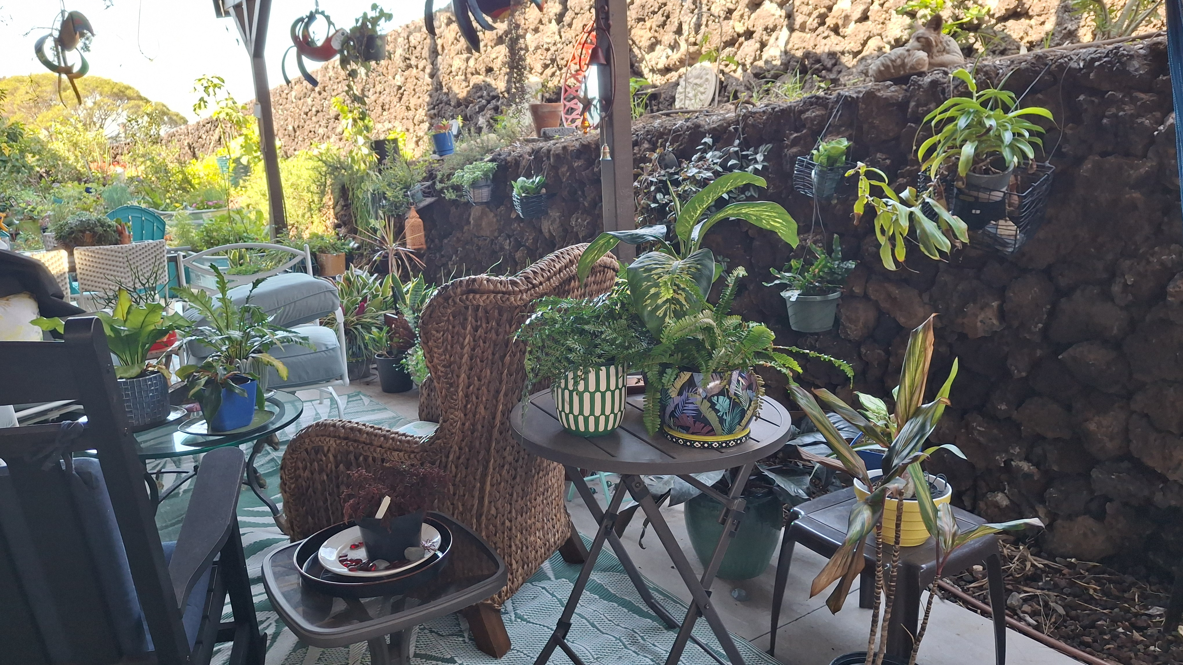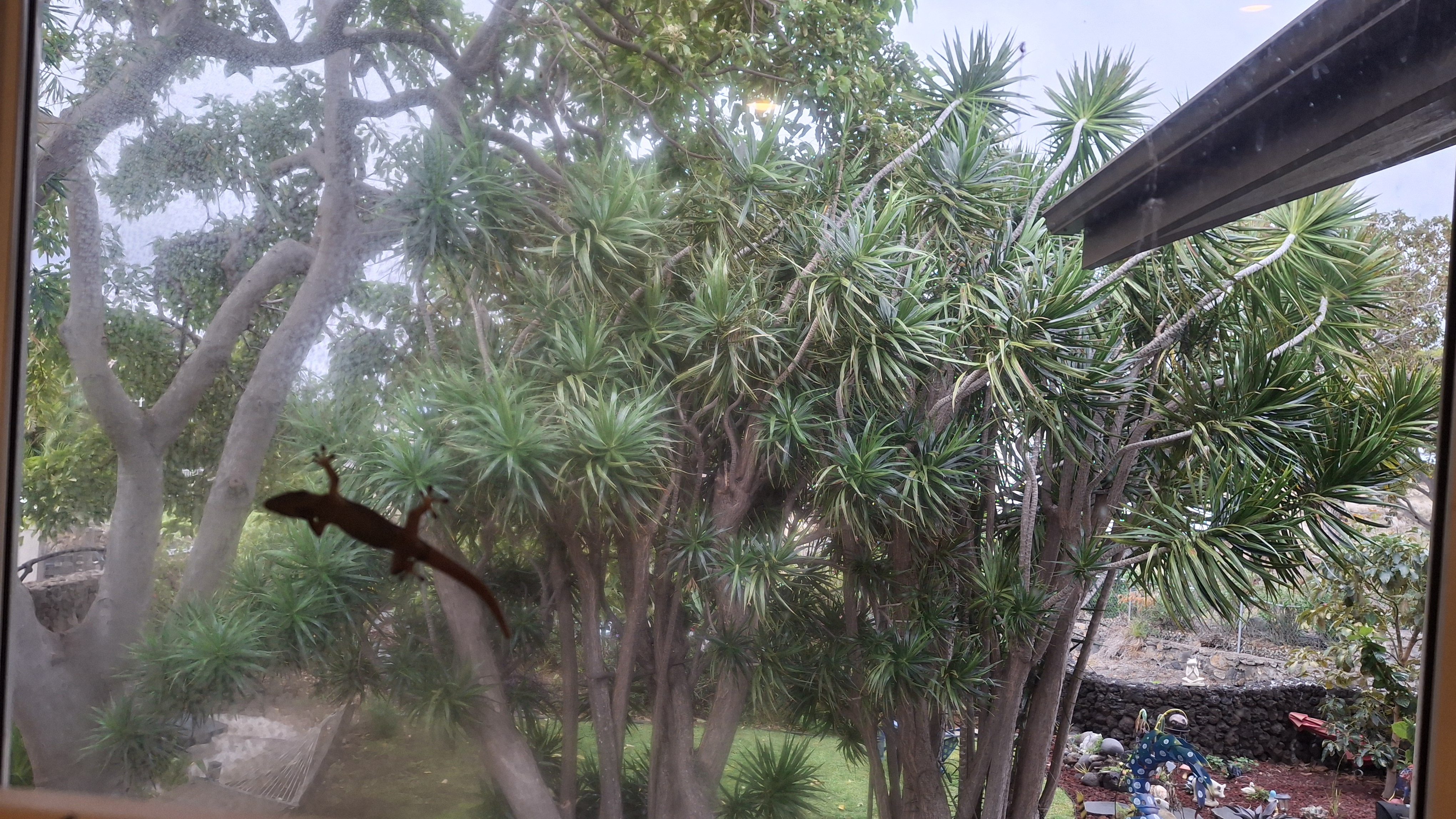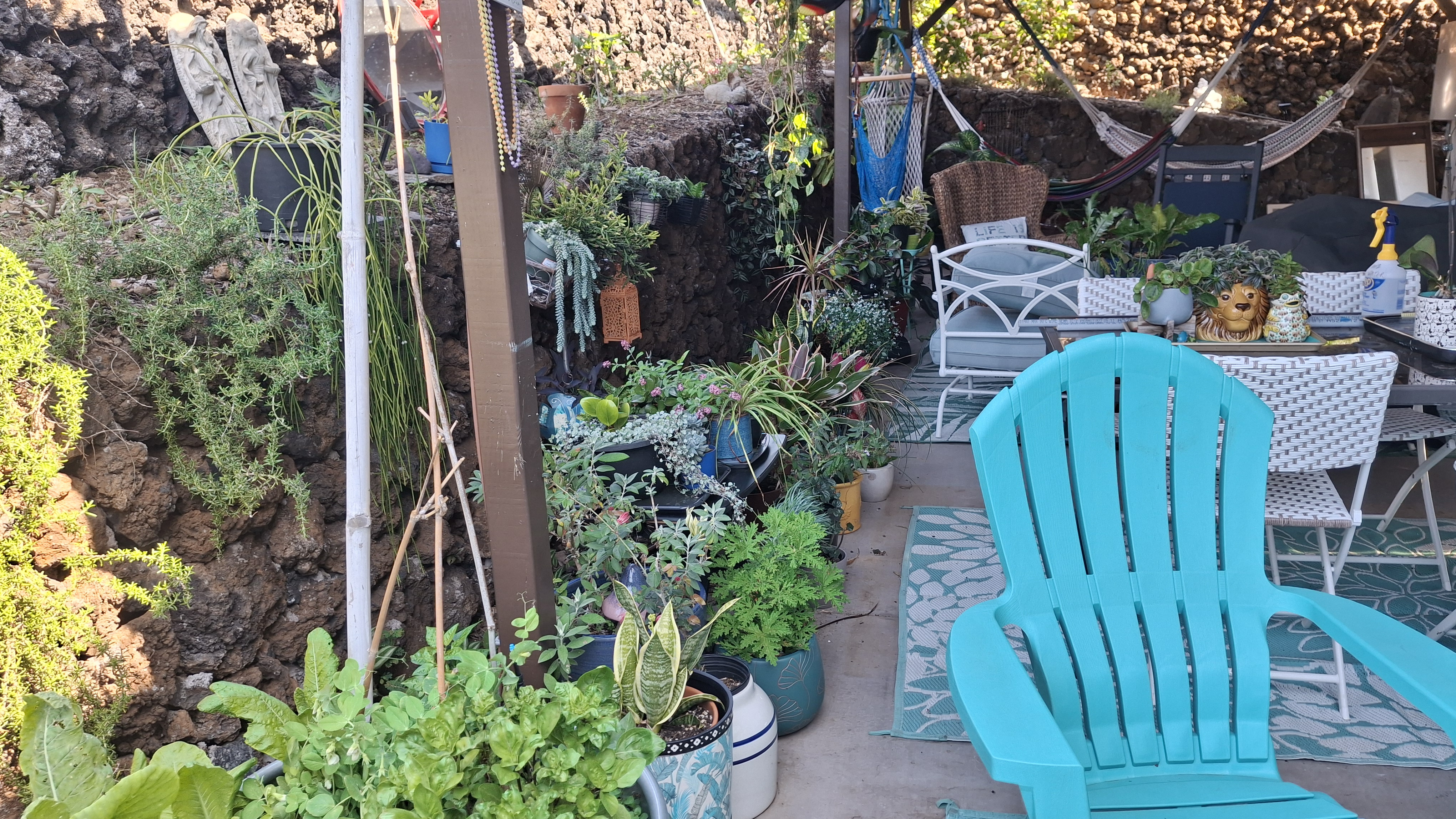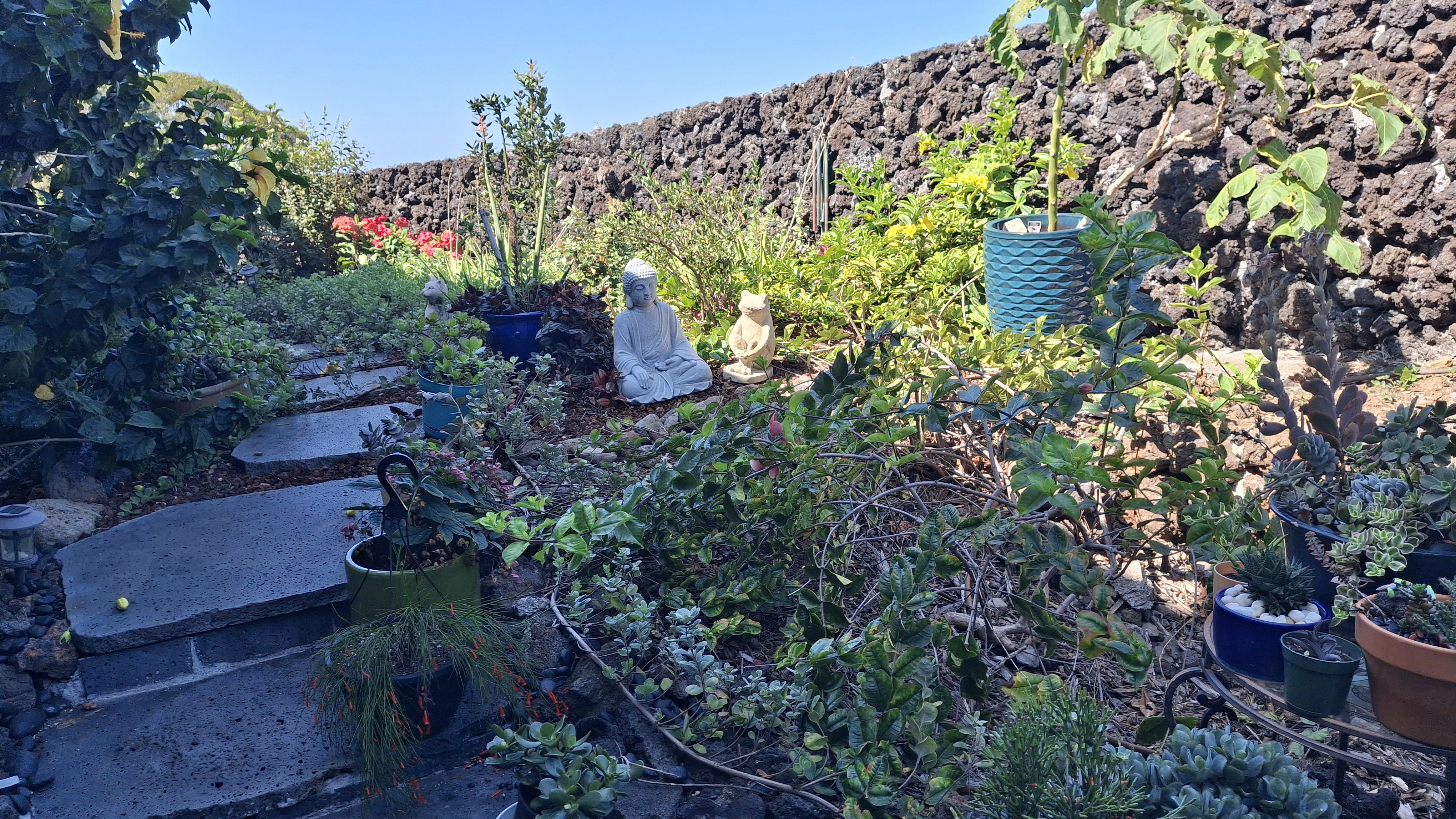When we applied for this sit, they were much more concerned with the garden than they were with the pets! And now I know why! I have never seen so many potted plants outside of a garden centre. They are all the way around the outside of the house. From my current seat on the Lanaii, there are 42. Then they line both sides of the stairs going to the front yard (about a dozen more), in front of the garage, under the banana trees by the side yard, under the back deck (another 143, and along the lava rock wall and walkway going across the back yard. Plus a half dozen gigantic pots on the top deck. At least there aren’t any inside!