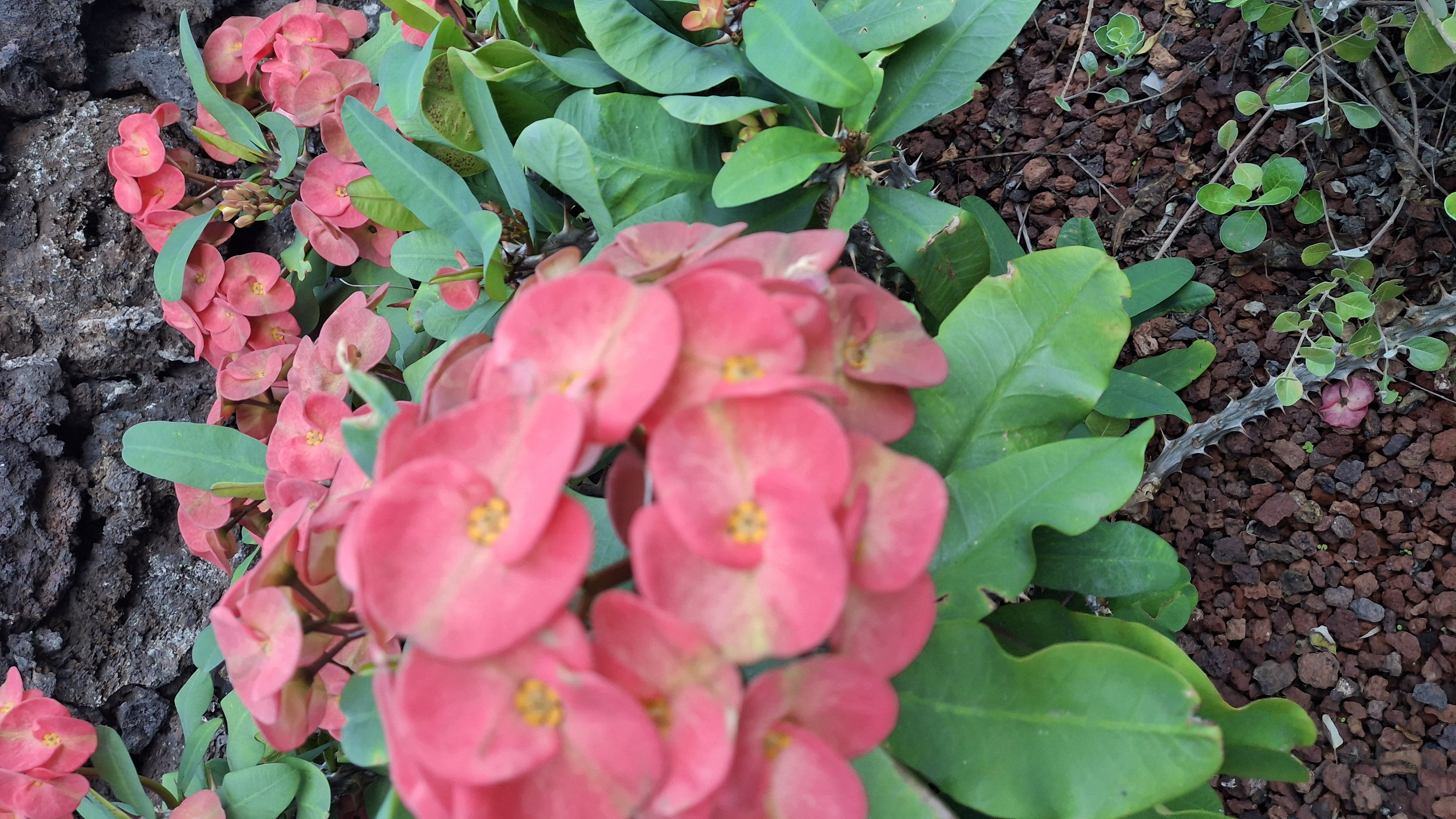 They have an avocado tree (no fruit yet), a mango tree (second set of fruit looking good but not ripe until later), and several banana plants (lots of little green bananas, and some yellow ones on the neighbour’s tree which hangs over the fence line… does that make them fair game??? PS YES THEY WERE FAIR GAME – AND DELICIOUS!!!), plus lots of herbs and a small raised bed with vegetables which are already growing like crazy even though they were just put in a week ago (some of the string beans look almost ready to eat!). Most of the potted plants are succulents, which are easy to care for. However, mixed in are ferns, peace lilies, poinsettias, a lovely orchid, a bunch of stuff that I know we have at home as houseplants, some variety of milkweed with only 2 leaves left on it which already has a Monarch chrysalis attached to the side of the pot, something that looks like polka dotted begonias on steroids, and countless things I can’t even name! As well there are flowers planted right in the ground, like the towering hibiscus plants in a variety of colours, and an amazing coral flower called a Crown of Thorns, which has the most wicked looking stems I have ever seen.